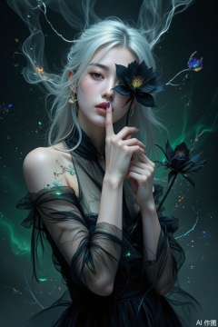 watercolor style,An Acrylic style painting that is expressive,gives it a dynamic and emotional quality. Anime art of a stylized portrait of a woman with a ethereal black and green mist surrounding her body. The mist creates a dramatic and surreal effect. A black flower,that is blooming,covering one eye,attached to the face. The woman has a cold aesthetic,complimented by her white hair. Anime art of woman draped in shadows with a lighting that enhances her unique features. The background is dark green,filled with black rose petals. Holding finger to lips,shush,shushing motion,.,Winslow Homer style,huge breasts,plbj,color-speckled background,digital-art,semi - transparent