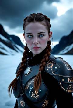 A captivating image emerges, focusing on a vikingpunk warrior-princess with her presence commanding attention in the icy wasteland. Her futuristic viking armor based on traditional viking armor, a seamless fusion of technology and her athletic form, slim-athletic form highlights her strength and agility. The warrior's twin braids with shaved sides, frames her determined expression, while her piercing eyes bore into the viewer. Ancient runes are etched into her battleaxe and armor, crackling with mystical glowing energy. The frozen landscape, a testament to her people's resilience, stretches into the distance, where dark, ominous clouds partially veil the rugged mountainous pass, filling the air with crispness and the promise of lightning. This artwork, with its Nordic and Viking-inspired elements, captures the essence of a powerful futuristic figure, seamlessly blending ancient traditions with futuristic innovations. Beauty, chiaroscuro, play of shadow and light, realistic,   <lora:flux_trainer/moxiePunk_v4D>