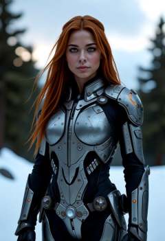 vikingpunk style  mature  resilient female (XX) mexican, caramel skin, hazel eyes, character, Lean build, extra long straight down ginger hair, ,, wearing a steel gray mechanized cyberpunk exosuit, thunderhide boots, hydraulic exosuit, set in  the imposing asgardian-palace, a gleaming structure of polished metal and rune-etched crystal, rising above the vikingpunk metropolis, seat of power and symbol of ambition. a hidden path through a snow-covered-forest, leading to a secluded cabin or a forgotten shrine, shrouded in mystery and whispering secrets to the wind. , at dusk,,   <lora:flux_trainer/moxiePunk_v4D>
