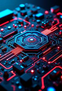 This image is a high-resolution CGI (computer-generated imagery) rendering of a futuristic circuit board. The board is intricately designed with a mix of vibrant blue and red neon lines that create a three-dimensional effect, giving the appearance of depth and complexity. The board is composed of multiple layers, each with its own set of circuitry and components. At the center, there is a prominent, hexagonal-shaped module with intricate patterns and smaller components embedded within it. The blue lines represent power or data pathways, while the red lines denote more complex or critical circuits. Various components, such as resistors, capacitors, and transistors, are scattered throughout the board, each with its own distinct shape and color. The background is a dark, gradient shade that enhances the neon glow of the circuitry, making the board appear almost holographic. The overall texture is smooth and sleek, suggesting a high-tech, advanced electronic device. The image captures the essence of cutting-edge technology, with a focus on precision and efficiency.,  <lora:art and styles/Defluxion II.safetensors:1.0>,