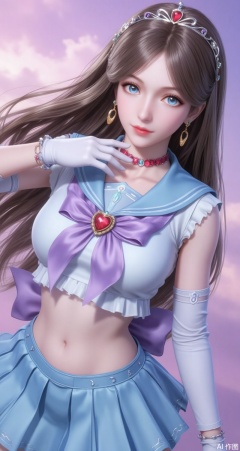 baoshi,lvjing,brown hair,long hair,blue eyes,fair_skin,jewelry,hair_ornament,earrings,1girl,sailor senshi uniform,solo,jewelry,skirt,gloves,earrings,blue skirt,white gloves,sailor collar,bow,breasts,choker,elbow gloves,magical girl,back bow,covered navel,heart,pleated skirt,looking at viewer,brooch,purple bow,heart brooch,red choker,circlet,miniskirt,closed mouth,large breasts,collarbone,red gemstone,tiara,cowboy shot,simple background,gradient background,close-up details,outstanding style,adding a touch of dimension to your images without compromising details,close-up,