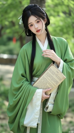 The image is a portrait of a young woman dressed in traditional Chinese clothing. She is standing in a garden with a tree in the background. The woman is wearing a green kimono with a white blouse underneath and has long black hair tied up in a bun. She has a serious expression on her face and is holding a scroll in her hands. The scroll appears to be old and worn, with some writing on it. The overall mood of the image is peaceful and serene.