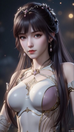 The image depicts a highly detailed digital artwork of a female character. She has long, dark hair styled in intricate braids, adorned with small, sparkling beads. Her eyes are large and expressive, with subtle makeup enhancing their natural beauty. She is wearing elegant, futuristic armor that is white with gold accents, giving her a regal and mystical appearance. The background is blurred, featuring a gradient of dark and light colors, which helps to focus attention on the character. The overall style is highly polished and detailed, typical of high-quality digital art.