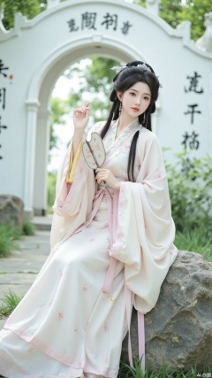 The image shows a young woman dressed in traditional Chinese clothing, sitting on a rock in front of a white archway with Chinese characters written on it. She is wearing a long, flowing white dress with a pink and yellow floral pattern and has long black hair styled in a traditional updo. The woman is holding a small fan in her hand and is looking off to the side with a serious expression on her face. The archway is surrounded by trees and greenery, and there is a stone pathway leading up to it. The overall mood of the image is peaceful and serene.