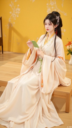 The image shows a young woman sitting on a wooden floor in front of a yellow wall with a floral design. She is wearing a long, flowing white dress with orange and green accents. The dress has a high neckline and long sleeves. She has long dark hair styled in loose waves and is holding a small green object in her hand. The woman is looking off to the side with a serious expression on her face. The background is blurred, but it appears to be a room with a window and a vase of orange flowers. The overall mood of the image is elegant and romantic.