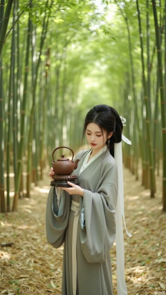 The image shows a young woman standing in a bamboo forest. She is wearing a traditional Chinese outfit, which consists of a long grey robe with a white scarf tied around her neck. The robe is draped over her shoulders and she is holding a small brown teapot in her hands. The woman has her hair tied up in a bun and is looking down at the tea pot. The background is filled with tall bamboo trees and the ground is covered in fallen leaves. The overall mood of the image is peaceful and serene.