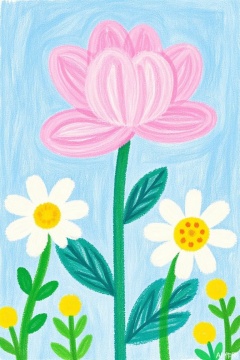 Children's picture book style,Children's picture book style,high quality,best quality,amazing quality,pink style,carnation flower,nature,Children's picture book style,lilies,floral,natural subject,vibrant colors,textured brush strokes,botanic,blue background,yellow and white flowers,canvas texture,nature-themed artwork,blooming,green foliage,Illustration,<lora people: ercha_SDXL-000007, 0.8,simple background,,