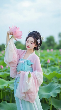 The image shows a young woman standing in a field of pink lotus flowers. She is wearing a traditional Chinese dress with a blue and pink color scheme. The dress has a high neckline and long sleeves, and the skirt is flowing in the wind. The woman is holding a large pink flower in her hand and is looking down at it with a peaceful expression on her face. She has dark hair styled in a bun with a flower crown on top. The background is filled with green leaves and trees, and there is a blue sky with white clouds. The overall mood of the image is serene and peaceful.