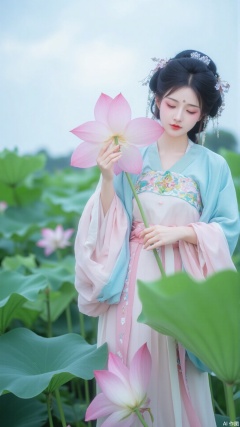 The image shows a young woman standing in a field of pink lotus flowers. She is wearing a traditional Chinese dress with a blue and pink color scheme. The dress has a high neckline and long sleeves, and the skirt is flowing in the wind. The woman is holding a large pink flower in her hand and is looking down at it with a peaceful expression on her face. She has dark hair styled in a bun with a flower crown on top. The background is filled with green leaves and trees, and there is a blue sky with white clouds. The overall mood of the image is serene and peaceful.