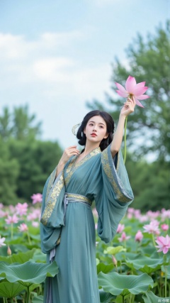 The image shows a young woman standing in a field of pink lotus flowers. She is wearing a long blue dress with gold embroidery and has her hair styled in an updo. The woman is holding a large pink flower in her right hand and is looking up at it with a peaceful expression on her face. The background is filled with lush green trees and a blue sky with white clouds. The overall mood of the image is serene and serene.