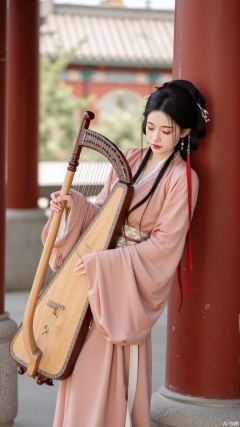 The image shows a young woman wearing a traditional Chinese Hanfu dress. She is standing in front of a red pillar and appears to be playing a stringed instrument. The woman has long dark hair tied up in a bun with a red flower in her hair. She has a serious expression on her face and is looking down at the instrument with her eyes closed. The instrument she is playing is a long stringed harp with a wooden body and strings. The background is blurred, but it seems to be an outdoor setting with trees and buildings visible.
