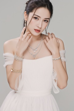 A woman is wearing a white dress. She has a necklace around her neck. There are bracelets on her wrist and a ring on her finger. The woman has earrings on her ears.