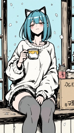 vari,vari, line art, manga-style, sfw, 1girl, shoulder-length blue hair, cat ears headband, oversized sweater, shorts, thigh-high stockings, sitting on a windowsill, holding a cup of tea, snow falling outside, cozy room background, sleepy expression, original