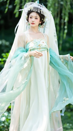 The image is a portrait of a young woman wearing a traditional Chinese wedding dress. She is standing in a garden with greenery in the background. The woman is wearing a long, flowing white dress with a blue and green floral pattern on the bodice and skirt. The dress has a high neckline and long sleeves, and the skirt is flowing in the wind. She has a white veil covering her head, which is tied in a bow at the top. Her hair is styled in an updo with a flower crown on top, and she is looking off to the side with a serious expression on her face. The overall mood of the image is elegant and romantic.