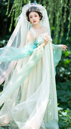 The image is a portrait of a young woman wearing a traditional Chinese wedding dress. She is standing in a garden with greenery in the background. The woman is wearing a long, flowing white dress with a blue and green floral pattern on the bodice and skirt. The dress has a high neckline and long sleeves, and the skirt is flowing in the wind. She has a white veil covering her head, which is tied in a bow at the top. Her hair is styled in an updo with a flower crown on top, and she is looking off to the side with a serious expression on her face. The overall mood of the image is elegant and romantic.