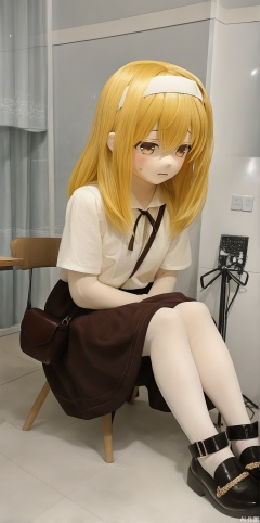 A young girl sits uncomfortably on a worn wooden chair, her legs splayed at an awkward angle as one foot dangles without shoes, while the other remains clad in scuffed leather footwear. Her expression is one of disgust and discomfort, her eyes squinted in distaste. A faint sheen of sweat glistens on her calf as it begins to leak with moisture. A cluttered desk lies beside a large window, where the warm sunlight streaming in creates a beautiful Tyndall effect, casting a mesmerizing glow over the scene.YanQiaoke,long_hair,shoulder bag,brown eyes,white shirt,Long skirt,yellow hair,ribbon headband,brown skirt,kigurumi