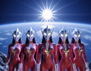 Several girls stand apart,They brought different kinds of Ultraman helmets. with long black hair, dangling earrings, necklaces, large breasts, slim waists, and long legs, Wearing a scarlet battle suit with a golden pentagram pattern on it, the eyes of the helmets have long glowing eyelashes, the corners of the eyes on the helmets are long, horns grow on the helmets, and the eyes of the helmets emit rays of various colors.atm,Standing at the top of Mount Tai, there is a fiery sun amidst the swirling clouds,Starlight filter,with white dots dotting the entire image,YLN,juru2