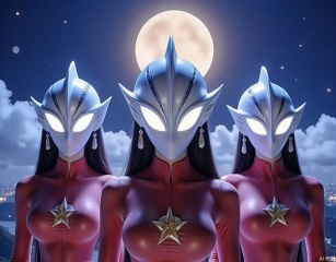 Several girls stand apart,They brought different kinds of Ultraman helmets. with long black hair, dangling earrings, necklaces, large breasts, slim waists, and long legs, Wearing a scarlet battle suit with a golden pentagram pattern on it, the eyes of the helmets have long glowing eyelashes, the corners of the eyes on the helmets are long, horns grow on the helmets, and the eyes of the helmets emit rays of various colors.atm,Standing at the top of Mount Tai, there is a fiery sun amidst the swirling clouds,Starlight filter,with white dots dotting the entire image,YLN,juru2