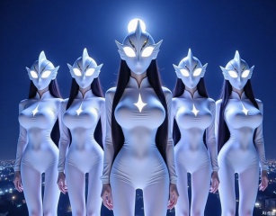 Five girls stood separately, wearing different styles of Ultraman helmets. They have long black hair, pendant earrings, glowing gem necklaces, plump breasts, slender waists and slender legs. They wear different colors of futuristic battle suits, with glowing six-pointed energy lamps on their chests, and the eyes of the helmet have long glowing eyelashes. The eyes of the helmet are long, and the eyes of the helmet emit light of various colors. atm, standing on the top of Mount Tai, in the rolling clouds, there is a hot sun, dazzling and beautiful starlight, YLN, juru2