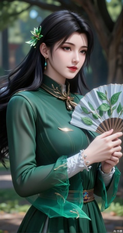 Her right hand gently rises, holding a delicate fan, the fan's surface adorned with leaves and vines, as if merging with the forest. The fan gently unfolds, swaying slightly with her movements, as if transmitting a gentle signal to the forest. Her fingers are slender and long, her nails neatly trimmed and clean, exuding an elegant charm. Her arm lines are smooth, her movements natural, revealing a calm and graceful demeanor.