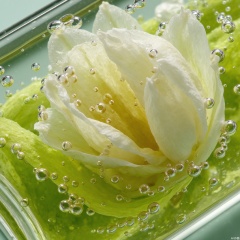 Close-up of the flower, submerged in water, with tender petals, semi-transparent surface, white to light yellow, smooth edges, slightly curved, soft surface, small bubbles, bright green base color, clear water, upon closer inspection, no product, no one,key-998-key