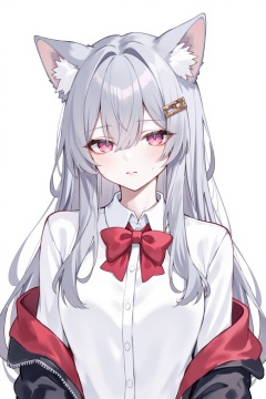cool,Indol,cocoball,AU,dw,crisp,1girl,solo,animal ears,long hair,shirt,hair ornament,bow,white shirt,upper body,cat ears,jacket,collared shirt,simple background,looking at viewer,grey hair,closed mouth,pink eyes,red bow,hairclip,bowtie,white background,open clothes,off shoulder,open jacket,expressionless,