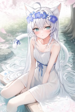 ,1girl,solo,long hair,looking at viewer,blush,bangs,blue eyes,hair ornament,dress,ribbon,animal ears,hair between eyes,bare shoulders,sitting,very long hair,collarbone,tail,flower,ahoge,white hair,outdoors,parted lips,sleeveless,day,cat ears,hair flower,water,white dress,:o,tree,wet,cat tail,animal ear fluff,bare arms,petals,sleeveless dress,feet out of frame,white flower,blue ribbon,cat girl,blue flower,head wreath,tail raised,flower wreath,shallow water,
