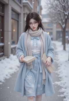 The girl's hair was slightly curly and was casually draped on her shoulders. There was a white velvet flower between her hair, just like a flower blooming in the snow. She was wearing a pair of black-framed glasses, and her eyes behind the lenses were clear and bright, exuding a faint bookish atmosphere. A beige wool scarf was wrapped around her neck, with some light blue embroidered patterns on the scarf, which echoed the coat. She was holding a hardcover book in her hand, with some snowflakes on the cover, as if it was specially prepared for this snowy day. The girl walked slowly, sometimes stopping, admiring the snow-covered buildings and trees on the street, sometimes lowering her head and flipping through the books in her hand, immersing in the beautiful atmosphere of words and snow scenes, as if integrated with the flying snow in the sky, forming a beautiful picture. ",zichu-2.5D