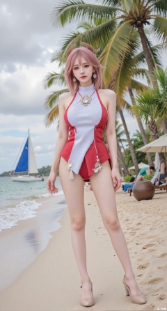 sfw,(masterpiece:1.2),best quality,absurdres,masterpiece,original,extremely detailed wallpaper,perfect lighting,1girl,solo,looking at viewer,(cowboy_shot:1.3),short hair,high heels,blurry background,depth of field,motion blur,crystal_earrings,headpiece,in summer,day,outdoors,nature,(standing,Seaside, beach, sailboat, coconut trees:1.59),(huge breasts:2.99),(full breasts:2.99),Xyuenanaodai,XzhihuaX,Xleidianjiangjun,Xxianingshuang