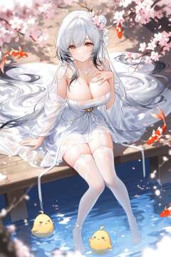 dutch angle,magical,evocative,highres,extremely detailed 8k wallpaper,illustration,depth of field,great quality,masterpiece,best quality,amazing quality,very aesthetic,absurdres,backlighting,detail eyes,artist:rella,artist:konya karasue,artist:an_yasuri,artist:kieed,artist:ruoganzhao,year 2023 BREAKcurvy,(narrow waist:1.1),Hai Tien (azur lane),white hair,multicolored hair,1girl,breasts,thighhighs,long hair,large breasts,dress,white thighhighs,looking at viewer,cleavage,white dress,very long hair,flower,solo,sitting,hair ornament,water,manjuu (azur lane),bare shoulders,see-through,necklace,full body,jewelry,bangs,garter straps,branch,cherry blossoms,grey hair,wooden floor,blush,white hair,hair flower,thighs,off shoulder,see-through dress,hand on own chest,wet clothes,sitting near water,feet in water,koi,from above,pond,<lora:Hai Tien (azur lane):0.6>,