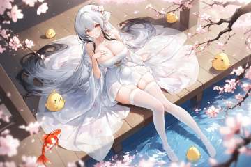 dutch angle,magical,evocative,highres,extremely detailed 8k wallpaper,illustration,depth of field,great quality,masterpiece,best quality,amazing quality,very aesthetic,absurdres,backlighting,detail eyes,artist:rella,artist:konya karasue,artist:an_yasuri,artist:kieed,artist:ruoganzhao,year 2023 BREAKcurvy,(narrow waist:1.1),Hai Tien (azur lane),white hair,multicolored hair,1girl,breasts,thighhighs,long hair,large breasts,dress,white thighhighs,looking at viewer,cleavage,white dress,very long hair,flower,solo,sitting,hair ornament,water,manjuu (azur lane),bare shoulders,see-through,necklace,full body,jewelry,bangs,garter straps,branch,cherry blossoms,grey hair,wooden floor,blush,white hair,hair flower,thighs,off shoulder,see-through dress,hand on own chest,wet clothes,sitting near water,feet in water,koi,from above,pond,<lora:Hai Tien (azur lane):0.6>,
