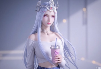 baoshi,lvjing,bosaixi,white hair,long hair,fair_skin,purple eyes,crown,jewelry,earrings,1girl,skirt,plaid skirt,realistic,solo,plaid,cup,blurry background,blurry,looking at viewer,holding,disposable cup,holding cup,hairband,sweater,necklace,crop top,blue hairband,midriff,shirt,jewelry,white sweater,off shoulder,white shirt,4,cover,simple background,gradient background,close-up details,outstanding style,adding a touch of dimension to your images without compromising details,close-up