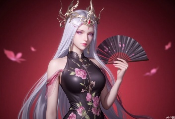 baoshi,lvjing,bosaixi,white hair,long hair,fair_skin,purple eyes,crown,jewelry,earrings,1girl,dress,hand fan,holding,solo,earrings,jewelry,chinese clothes,china dress,black dress,holding fan,floral print,blurry,sleeveless,looking at viewer,sleeveless dress,red background,folding fan,standing,head tilt,2,cover,simple background,gradient background,close-up details,outstanding style,adding a touch of dimension to your images without compromising details,close-up