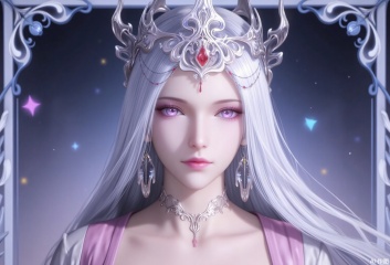 baoshi,lvjing,bosaixi,white hair,long hair,fair_skin,purple eyes,crown,jewelry,earrings,1girl,solo,earrings,jewelry,looking at viewer,breasts,tarot,collarbone,upper body,dress,closed mouth,card \(medium\),tarot \(medium\),frills,border,cover,gradient background,close-up details,outstanding style,adding a touch of dimension to your images without compromising details,close-up