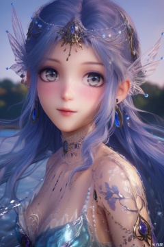 1girl,solo,long hair,looking at viewer,grey eyes,very long hair,blue hair,earrings,blurry background,