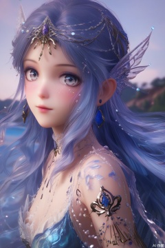 1girl,solo,long hair,looking at viewer,grey eyes,very long hair,blue hair,earrings,blurry background,
