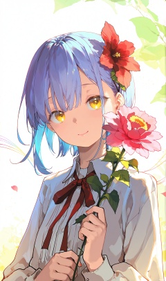 1girl, solo, looking at viewer, smile, short hair, bangs, simple background, shirt, hair ornament, long sleeves, white background, ribbon, holding, closed mouth, blue hair, yellow eyes, white shirt, upper body, flower, collared shirt, hair flower, red ribbon, neck ribbon, red flower, pink flower, holding flower