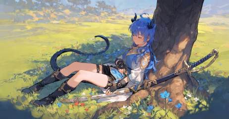 highres,extremely detailed 8k wallpaper,illustration,depth of field,great quality,masterpiece,best quality,amazing quality,very aesthetic,absurdres,Japanese fantasy style,artist:ciloranko BREAK<lora:Japanese fantasy style:0.8>, -1girl, blue hair, solo, sitting, tail, horns, weapon, tree, closed eyes, grass, outdoors, gloves, flower, dragon tail, ahoge, against tree, shorts, sleeping, long hair, fingerless gloves, dragon horns, sword, boots, sheath, sheathed, dragon girl
