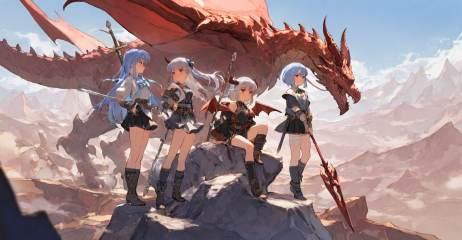 highres,extremely detailed 8k wallpaper,illustration,depth of field,great quality,masterpiece,best quality,amazing quality,very aesthetic,absurdres,Japanese fantasy style,artist:ciloranko BREAK<lora:Japanese fantasy style:0.8>, -multiple girls, weapon, holding, sitting, skirt, 3girls, outdoors, long hair, holding weapon, standing, wings, polearm, sky, rock, blue hair, horns, short hair, cloud, open mouth, holding polearm, dragon, red eyes, sword, socks, boots, fantasy, spear, pleated skirt, day, bare shoulders, red wings, grey hair, mountain, bandages, black skirt, closed mouth, shirt, smile, jacket, belt, bow, shorts, blue eyes