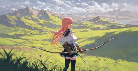 highres,extremely detailed 8k wallpaper,illustration,depth of field,great quality,masterpiece,best quality,amazing quality,very aesthetic,absurdres,Japanese fantasy style,artist:ciloranko BREAK<lora:Japanese fantasy style:0.8>, -1girl, bow (weapon), weapon, solo, thighhighs, outdoors, skirt, long hair, pink hair, gloves, holding, mountain, scenery, cloud, arrow (projectile), capelet, holding weapon, black thighhighs, sky, zettai ryouiki, holding bow (weapon), black skirt, cloudy sky, standing, grass, long sleeves, day, quiver, landscape, brown gloves