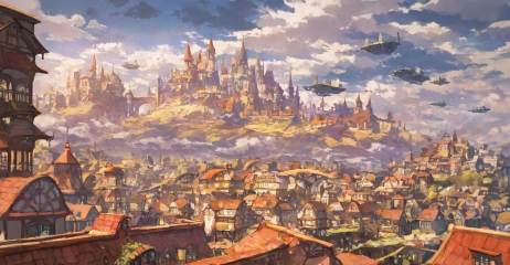 highres,extremely detailed 8k wallpaper,illustration,depth of field,great quality,masterpiece,best quality,amazing quality,very aesthetic,absurdres,Japanese fantasy style,artist:ciloranko BREAK<lora:Japanese fantasy style:0.8>, -Japanese fantasy style, cloud, no humans, scenery, sky, building, fantasy, city, outdoors, cloudy sky, aircraft