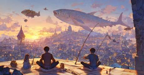 highres,extremely detailed 8k wallpaper,illustration,depth of field,great quality,masterpiece,best quality,amazing quality,very aesthetic,absurdres,Japanese fantasy style,artist:ciloranko BREAK<lora:Japanese fantasy style:0.8>, -Japanese fantasy style, cloud, sitting, sky, scenery, indian style, sunset, building, fishing rod, outdoors, 1boy, city, aircraft, fantasy, from behind, 1girl, animal, cityscape