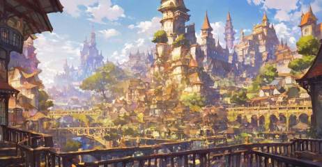 highres,extremely detailed 8k wallpaper,illustration,depth of field,great quality,masterpiece,best quality,amazing quality,very aesthetic,absurdres,Japanese fantasy style,artist:ciloranko BREAK<lora:Japanese fantasy style:0.8>, -Japanese fantasy style, scenery, cloud, sky, outdoors, day, building, bridge, architecture, tower, tree, city, stairs, castle, fantasy, railing
