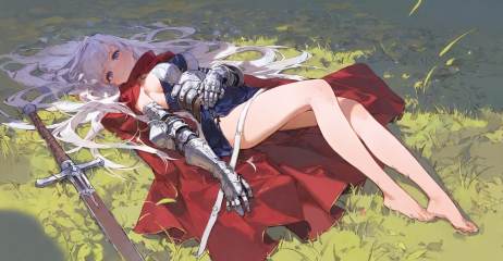 highres,extremely detailed 8k wallpaper,illustration,depth of field,great quality,masterpiece,best quality,amazing quality,very aesthetic,absurdres,Japanese fantasy style,artist:ciloranko BREAK<lora:Japanese fantasy style:0.8>, -1girl, barefoot, weapon, sword, long hair, gauntlets, solo, white hair, breasts, lying, sideboob, grass, on back, armor, bare legs, very long hair, dress, medium breasts, cape, looking at viewer, feet
