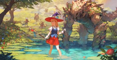 highres,extremely detailed 8k wallpaper,illustration,depth of field,great quality,masterpiece,best quality,amazing quality,very aesthetic,absurdres,Japanese fantasy style,artist:ciloranko BREAK<lora:Japanese fantasy style:0.8>, -Japanese fantasy style, hat, witch hat, 1girl, staff, skirt, gloves, white gloves, holding, short sleeves, blonde hair, puffy sleeves, vest, puffy short sleeves, holding staff, pleated skirt, flower, outdoors, plant, shirt, red skirt, witch, fantasy, standing, water, monster, tree, striped