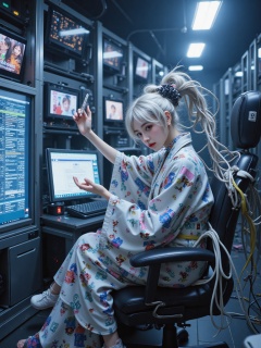 In the mid-shot of Data Fortress,a white-haired girl sits curled up in front of a giant array of servers,wearing a digital kimono **** of a collage of broken mobile phones (the collar is constantly refreshing the deleted chat records). She stabbed the console with a nerve invader in her right hand,and the palm of her left hand projected images of her childhood that were being tampered. The data cable hairpin between the buns is connected to the consciousness conduit hanging from the ceiling,and the kimono hem extends countless fiber tentacles,which are greedily absorbing the memory spots floating around. Under the transparent armor of the leg,the biological hard disk indicator light can be seen flashing. In the background of countless monitoring screens,"she" of different ages is simultaneously taking selfies with guns.,