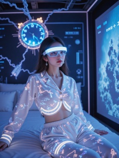 From the medium-view angle of the holographic studio,the Eurasian girl is suspended in the neural connection cabin 30cm from the bed surface,wearing brainwave-controlled fluorescent pajamas (the abstract pattern on the chest is being distorted according to the audience's reward value). A thought conduit extending from the temple visualized the dream: a molten digital clock floating overhead,a glowing chain of fan barrages wrapped around the waist. The edge of the smart goggles with the number of viewers,the ankle electrode patch converts muscle electrical signals into virtual gift effects,the projection on the background wall is showing a strange picture of her subconscious deep-sea scene interwoven with mathematical formulas,and the ring on the ring finger of her left hand is actually a miniature brainwave receiver.,