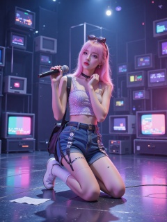 A holographic stage with a midground shot,where the virtual idol wears a 2000s retro crop top **** of programmable liquid crystal fabric that changes Y2K pixel patterns to the rhythm of the music. She kneels on one knee holding an old-fashioned microphone,while the microphone cable turns into a data stream connecting to an interface at the back of her head. The rivets on her denim hot pants are actually tiny speakers. LED strips on her knee-high socks form volume waveform graphics,and the choker around her neck converts fan comments into skin-electric-stimulation signals. In the background,there is a wall of CRT monitors with glitch art effects. When she tilts her chin up,a 3D scanner hidden among her pink wig captures the subtle facial expressions of the entire audience.,