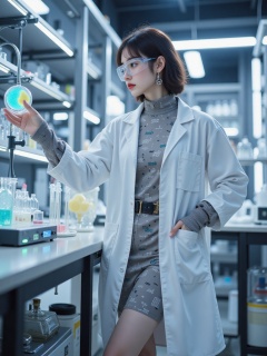 A scientific girl in a quantum laboratory scene,wearing a modified oversized shirt dress with a white coat,under which a tight-fitting suit printed with chemical equations can be seen through transparent PVC material. She is tiptoeing to reach the top culture dish,the fluorescent liquid in the test tube in her left hand flickers in sync with the hoop earrings. Miniature displays sewn onto the hem of the skirt are live-streaming the cell division process,experimental parameters scroll along the rim of the safety goggles,and the thick-soled Mary Jane shoes have built-in centrifuge models. Behind her,nanomaterials are floating and assembling on the lab table. The cold white light casts the shadow of precision instruments on her ceramic nails,and a molecular gastronomy-styled lipstick is attached to her tool belt around her waist.,