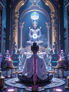 The middle scene of the holographic temple is composed of a girl with a mechanical arm suspended in front of the shrine of the circuit board in a lotus sitting posture,wearing an intelligent cassock spliced from the screen of a scrapped mobile phone (the binary code of the Great Compassion Curse is scrolled on the surface). Her left hand is printed,her palm is projected with the AR incense of fans' wishes,her right hand is holding a live stabilizer,and the top three Buddha head cameras are shooting at 360 degrees. The nano-particle Buddha's light wheel suspended at the back of the head changes color with the number of people interacting,and the maintenance panel unfolded at the knee exposes the antivirus software that is overshooting the virus. Background The electronic cigarette rising in the virtual censer forms a "666" barrage pattern,and the charging interface is exposed between the opening and closing of the mechanical lotus at the foot.,